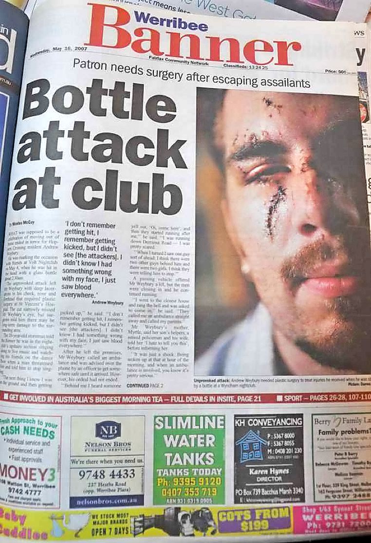 What was supposed to be a celebration of moving out of home ended in terror for Hoppers Crossing resident Andrew Weybury. He was marking the occasion with his friends at Volt Nightclub on May 6, when he was hit in the head with a glass bottle about 2.30am.
